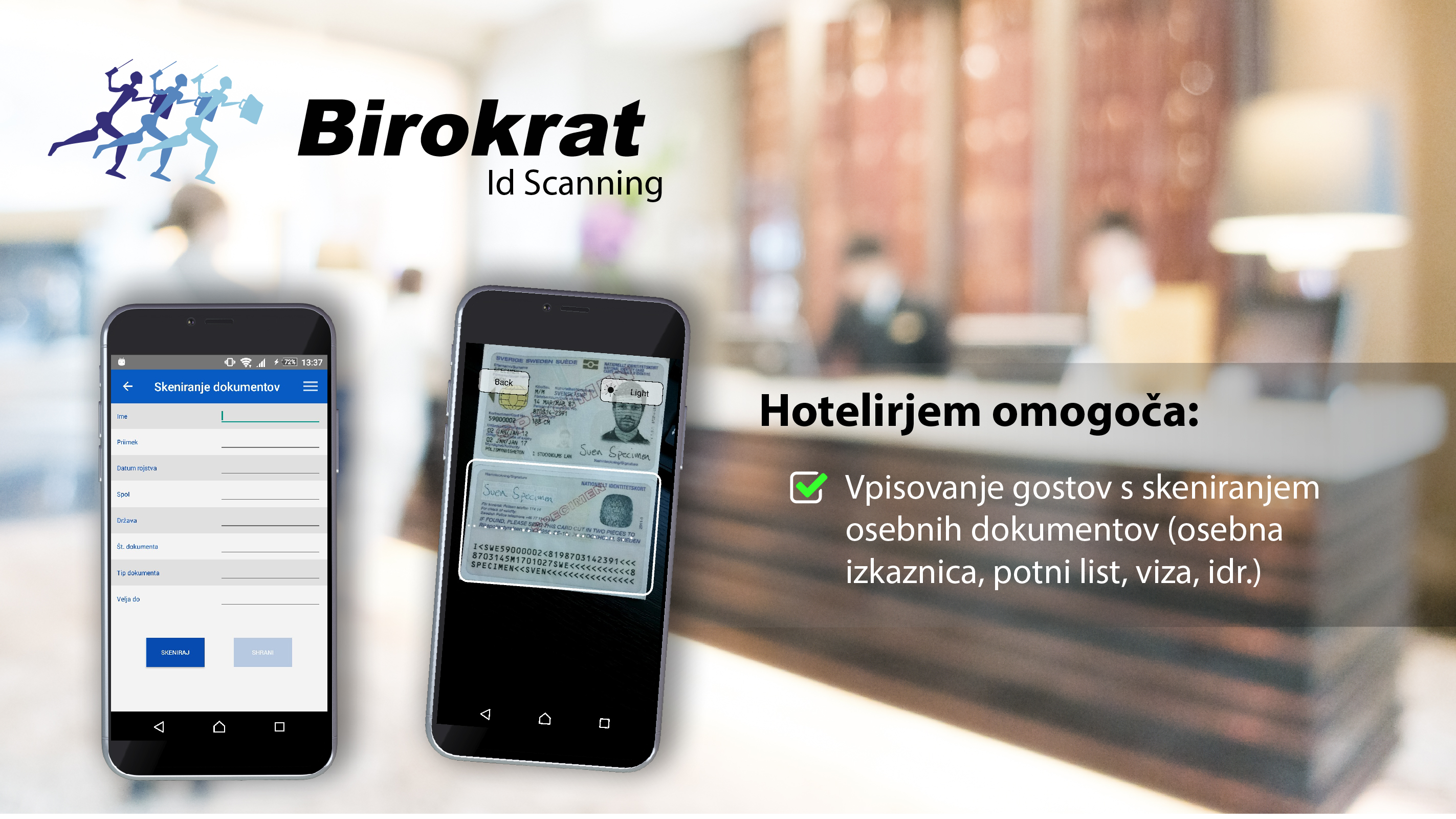 Birokrat Next ID Scanning je aplikacija za hotelirje, ki želijo pohitriti proces vpisovanja gostov v svoj hotel. Aplikacija to doseže s skeniranjem osebnih dokumentov preko kamere na pametnem telefonu oz. tablici.