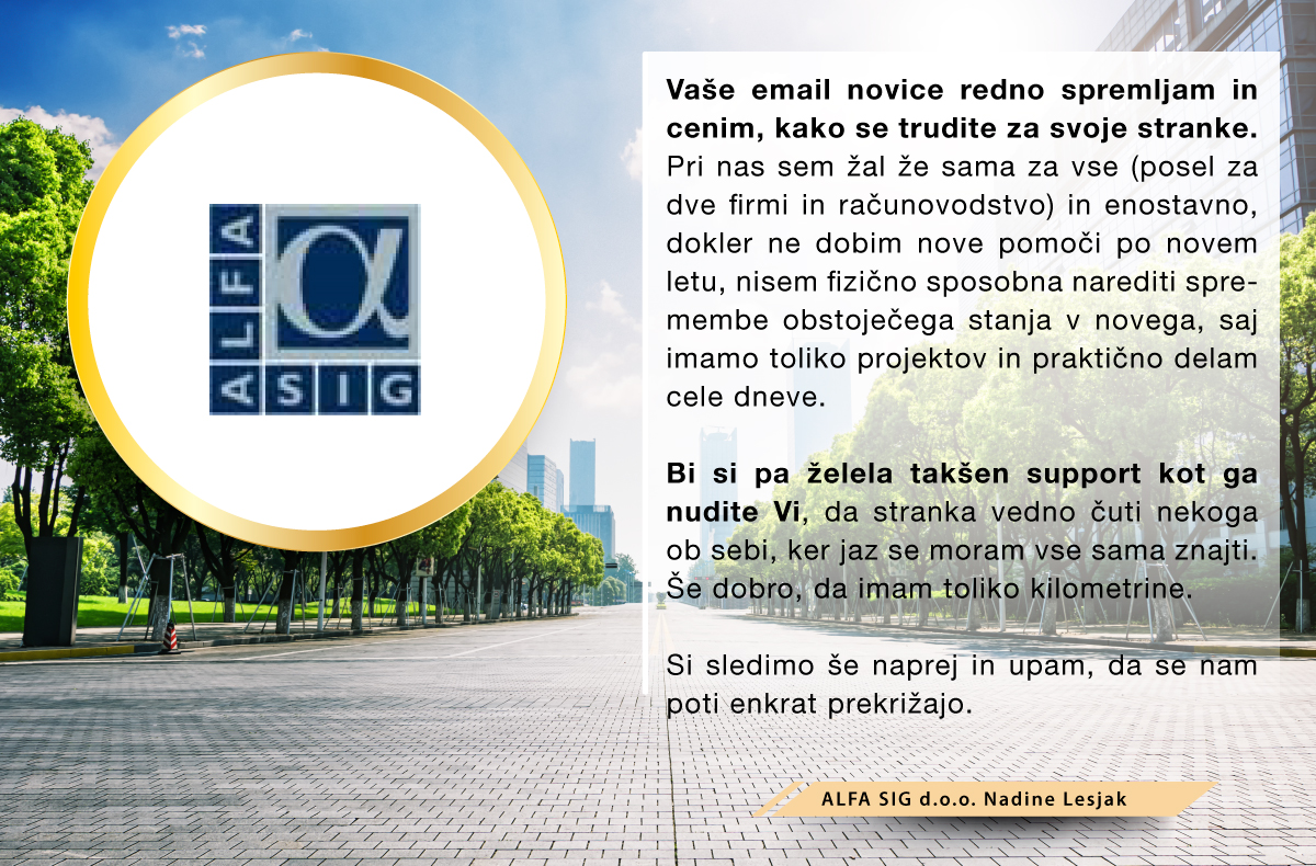 Iskreno se vam zahvaljujem za vso pomoč pri namestitvi programa in natančni in jasni razlagi kako zadeva deluje, predvsem pa za vašo potrpežljivost. Da ste mi dali neomejeno število možnosti, da vsakokrat preverim, če sem razumela in mi pri tem niste dajali občutka, da vam je to odveč ali da je z mano karkoli "narobe", ker "tega in tega" ne obvladam. Izjemno pozitivna izkušnja z delom z računalnikom. Prijetno presenečena.