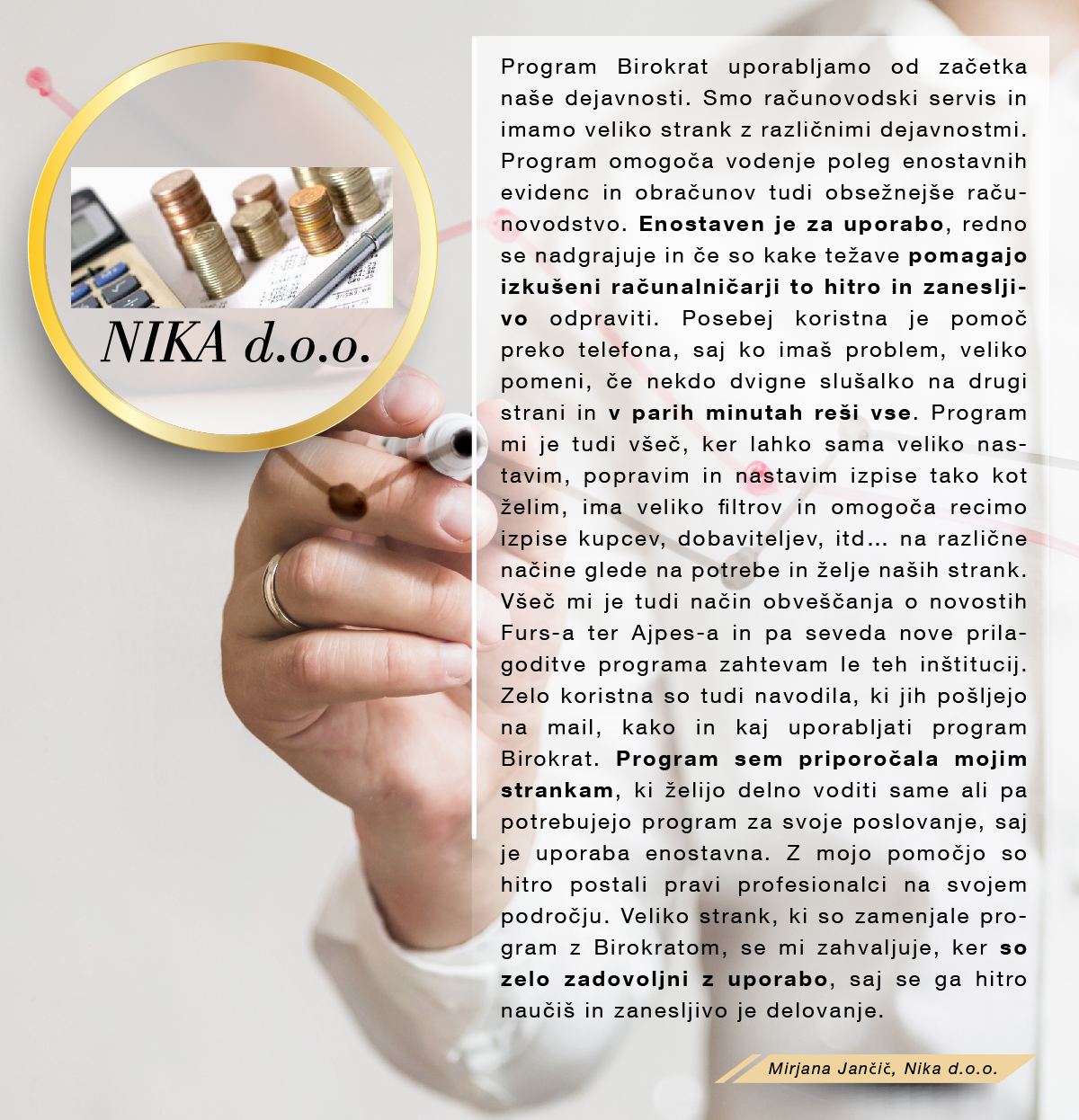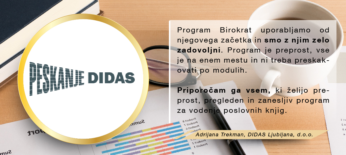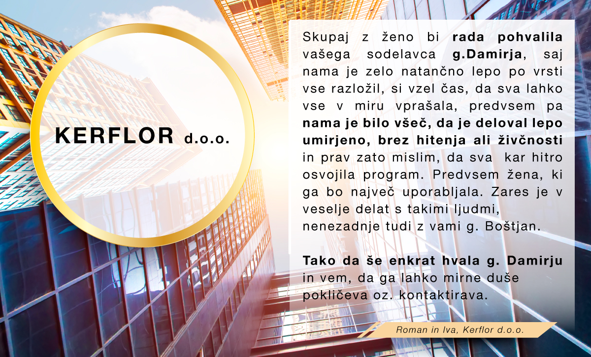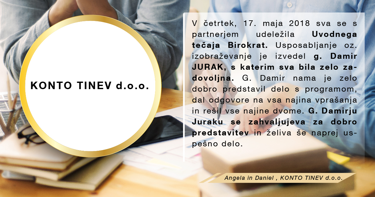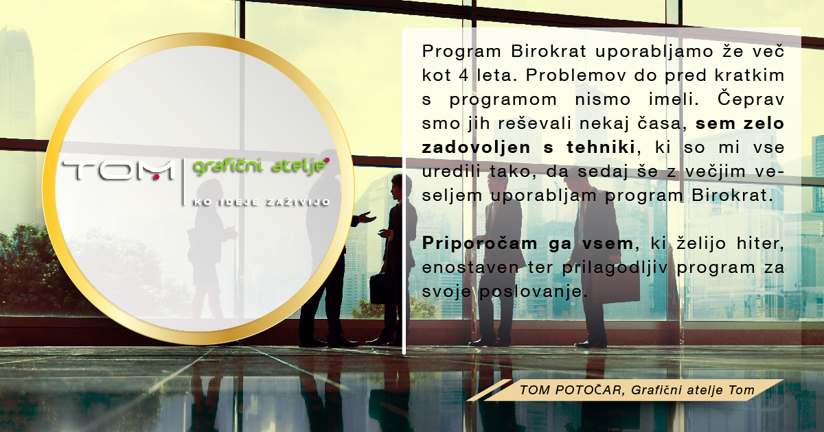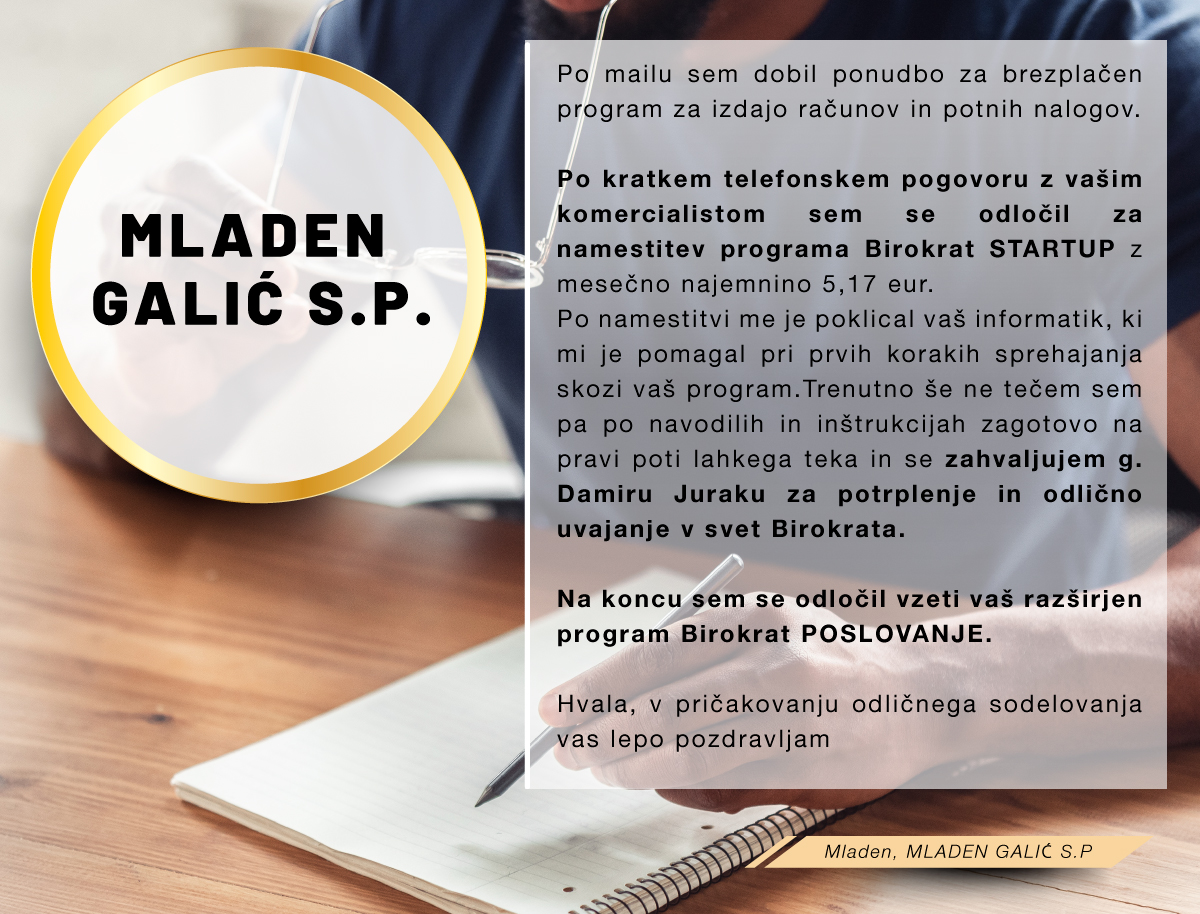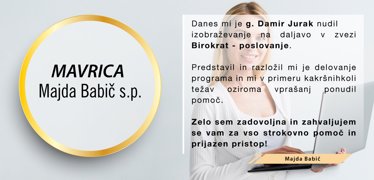 Med množico programov sem se odločila za program Birokrat, ker zajema vse, kar za svoje poslovanje potrebujem, ker je enostaven za uporabo, ko se ga navadiš in cenovno sprejemljiv. Ker je v podjetju zaposlenih kar nekaj strokovnjakov, ki redno spremljajo vse spremembe zakonodaje in v skladu s tem pripravljajo nadgradnje, me ne skrbi, da bi kaj pomembnega spregledala. In kar je zame najpomembnejše, je to, da če naletim na problem, ki ga ne znam sama rešiti, lahko pokličem in mi pomagajo na daljavo. Izjemno sem zadovoljna in hvaležna g.Juraku za vso podporo, kajti ravno on me je s svojo potrpežljivo razlago in demonstracijo prepričal, da je to pravi program zame, ki sem iz srednje generacije in nisem "otrok računalniške dobe".