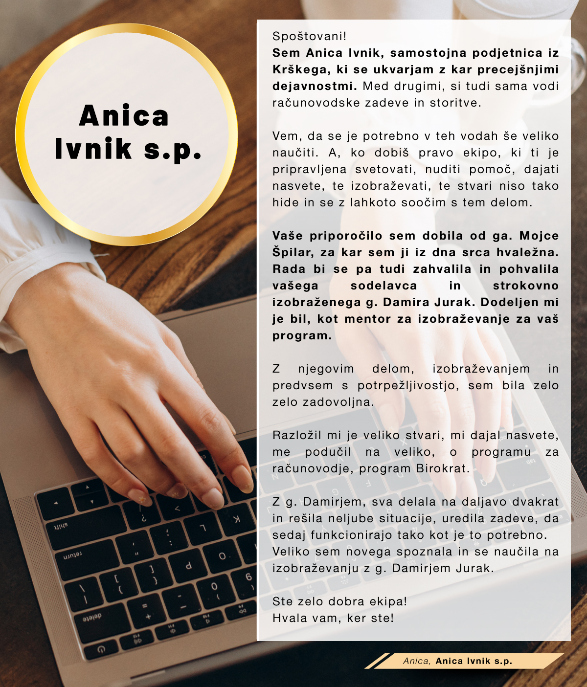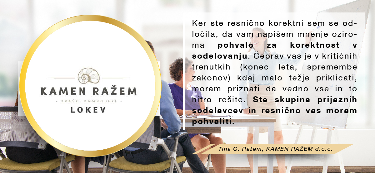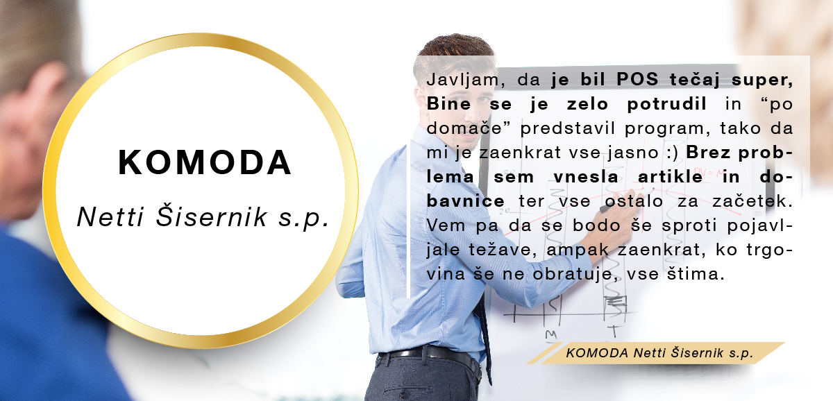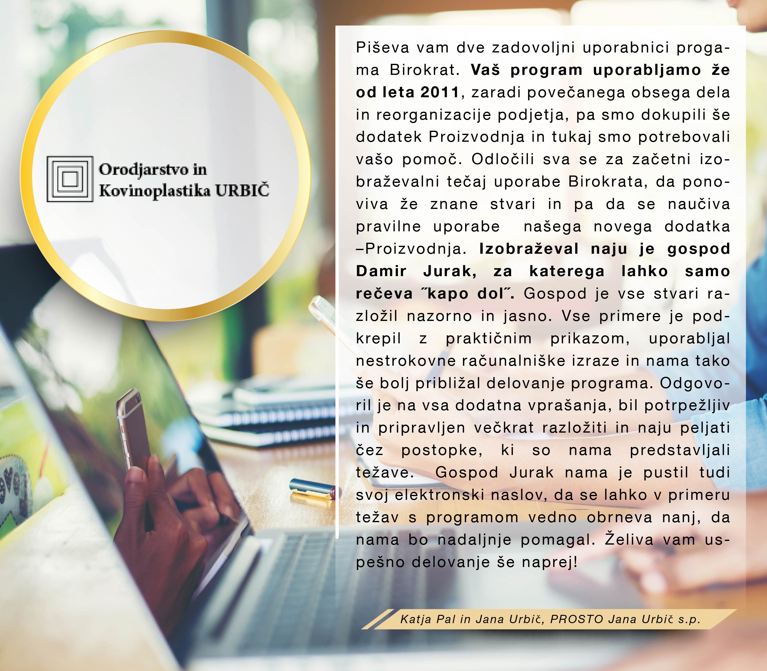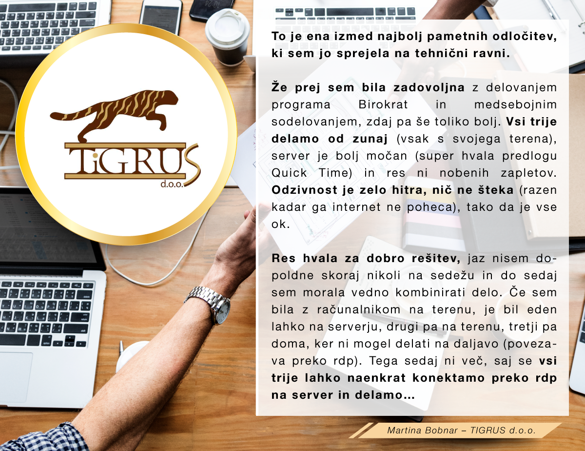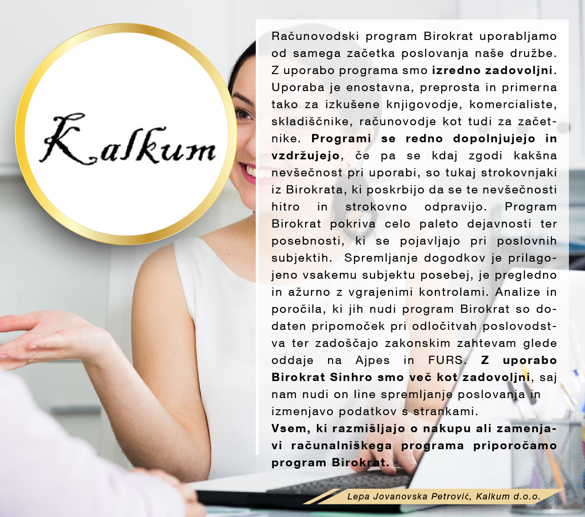 Med množico programov sem se odločila za program Birokrat, ker zajema vse, kar za svoje poslovanje potrebujem, ker je enostaven za uporabo, ko se ga navadiš in cenovno sprejemljiv. Ker je v podjetju zaposlenih kar nekaj strokovnjakov, ki redno spremljajo vse spremembe zakonodaje in v skladu s tem pripravljajo nadgradnje, me ne skrbi, da bi kaj pomembnega spregledala. In kar je zame najpomembnejše, je to, da če naletim na problem, ki ga ne znam sama rešiti, lahko pokličem in mi pomagajo na daljavo. Izjemno sem zadovoljna in hvaležna g.Juraku za vso podporo, kajti ravno on me je s svojo potrpežljivo razlago in demonstracijo prepričal, da je to pravi program zame, ki sem iz srednje generacije in nisem "otrok računalniške dobe".