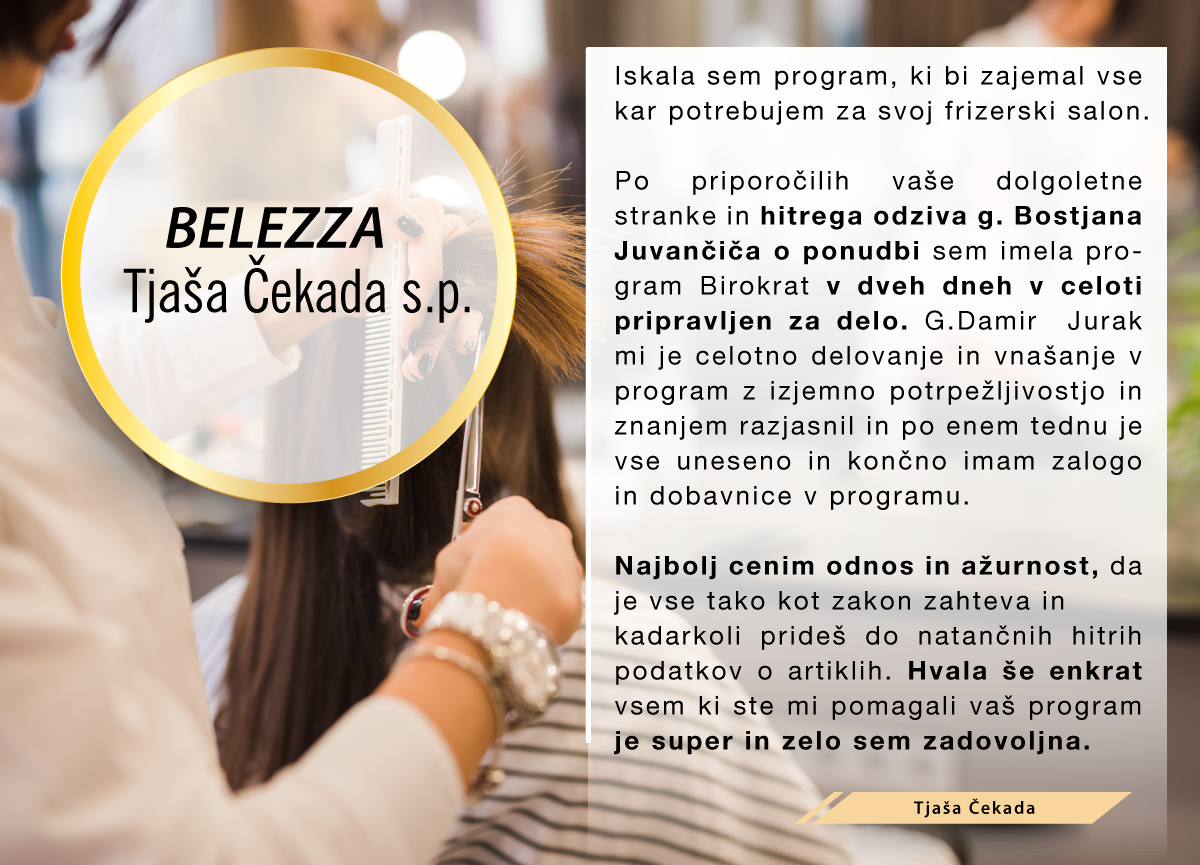 S podjetjem Birokrat me je seznanila prijateljica, ki že vrsto let uporablja njihov program, zato sem se zanj odločila tudi sama. In moram priznati, da mi ni niti malo žal. V prvi vrsti so se v podjetju zelo potrudili, da smo s skupnimi močmi našli modul programa, ki je zame najprimernejši. Ko pa sem s programom začela delati, so mi zaposleni brez težav pomagali in me uvedli v uporabo le-tega. Poleg izobraževanja, ki ga nudijo za nove in stare uporabnike, sem bila deležna tudi vse splošne pomoči preko telefona ter maila in moram priznati, da sem z njihovim odzivom, strokovnostjo in prijaznostjo nadpovprečno zadovoljna. Kar pa se samega programa tiče, mislim, da je vrhunsko dodelan in zelo prijazen do uporabnika, brez nepotrebne "solate" v ozadju in kljub temu ima integrirano v sebi vse, kar podjetnik potrebuje za lažje delo z dokumentacijo vseh vrst. Skratka z eno besedo VRHUNSKO."
