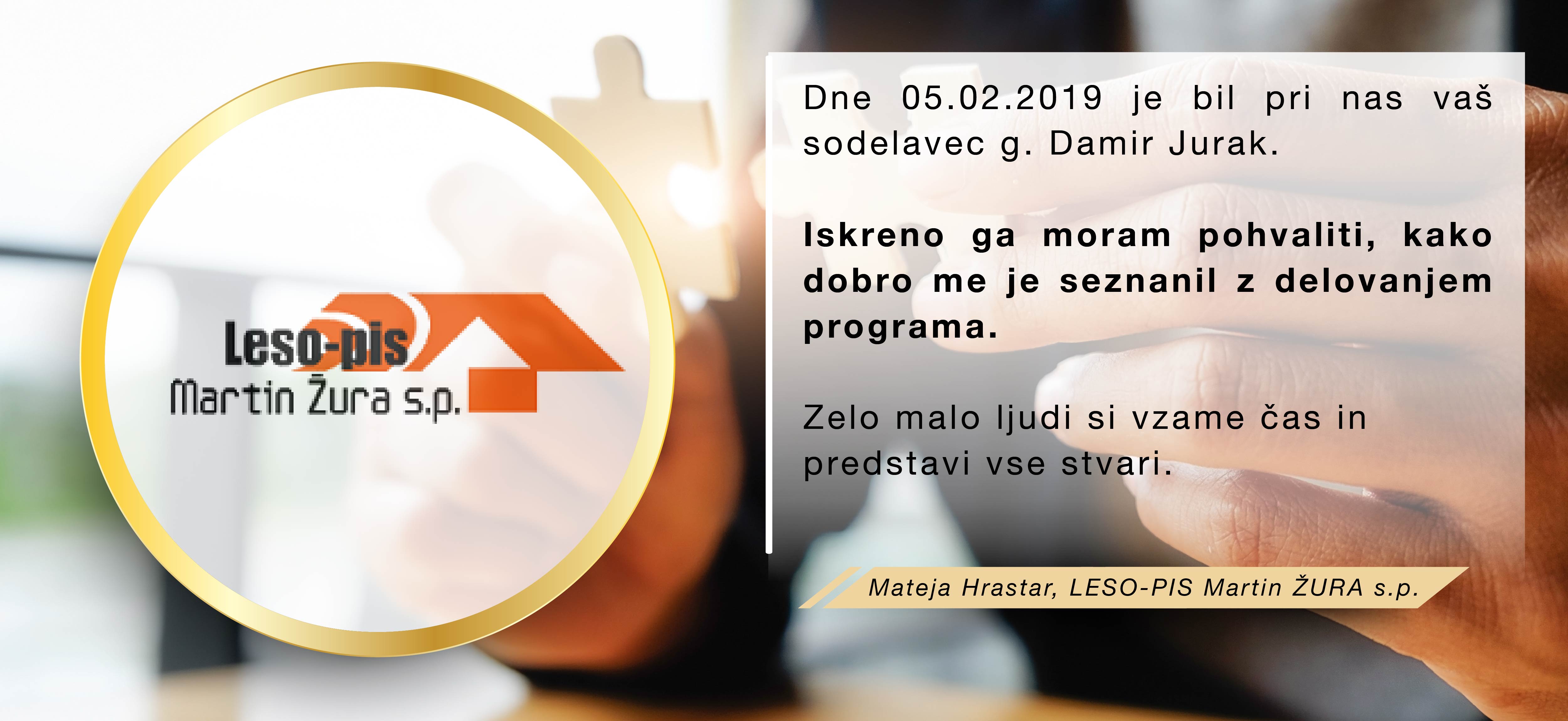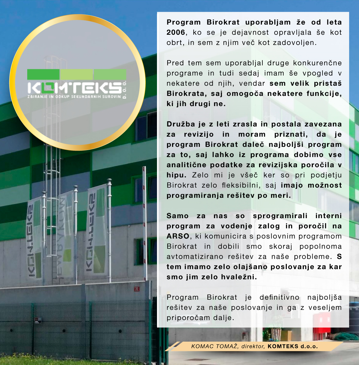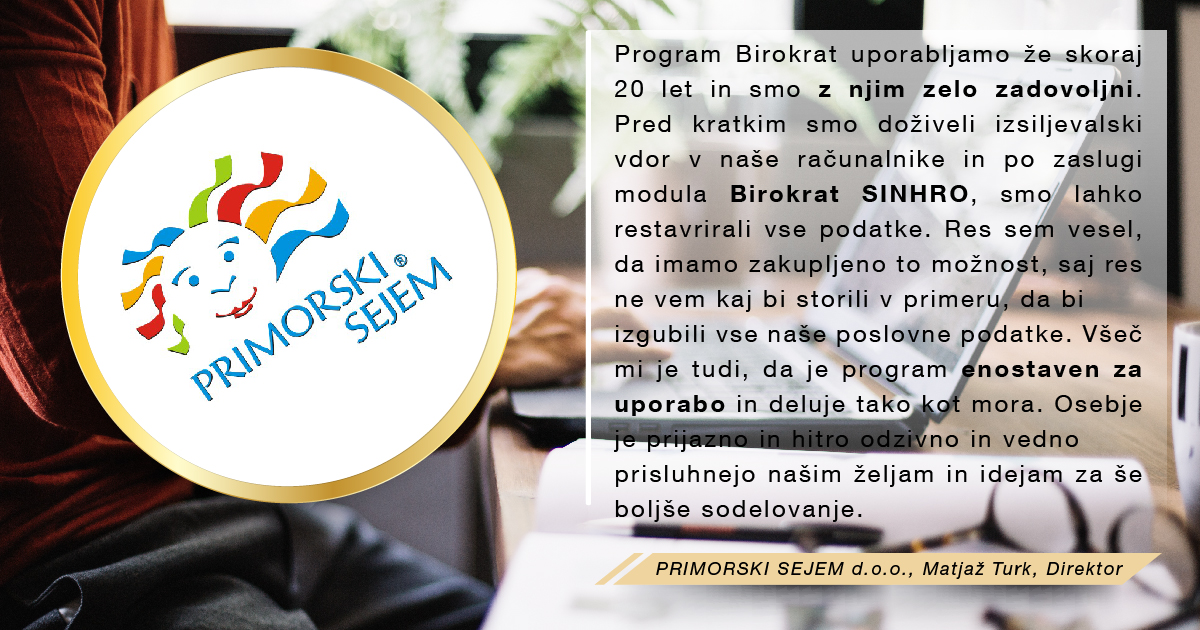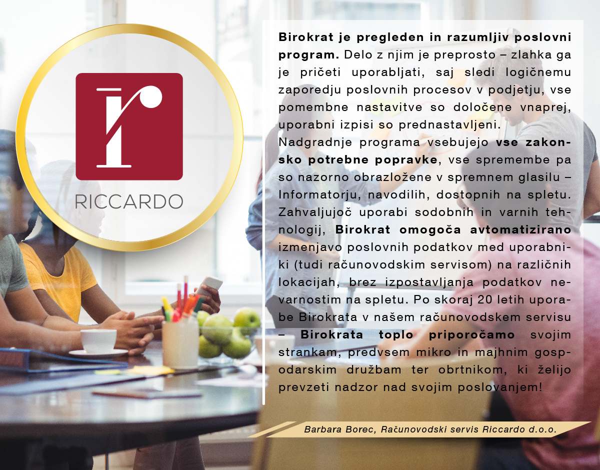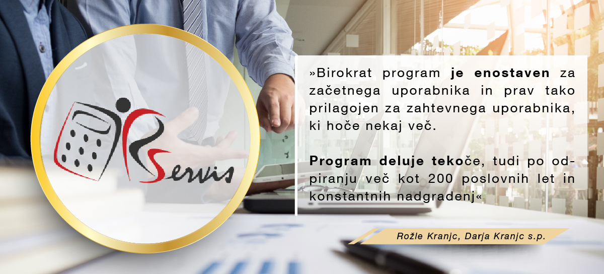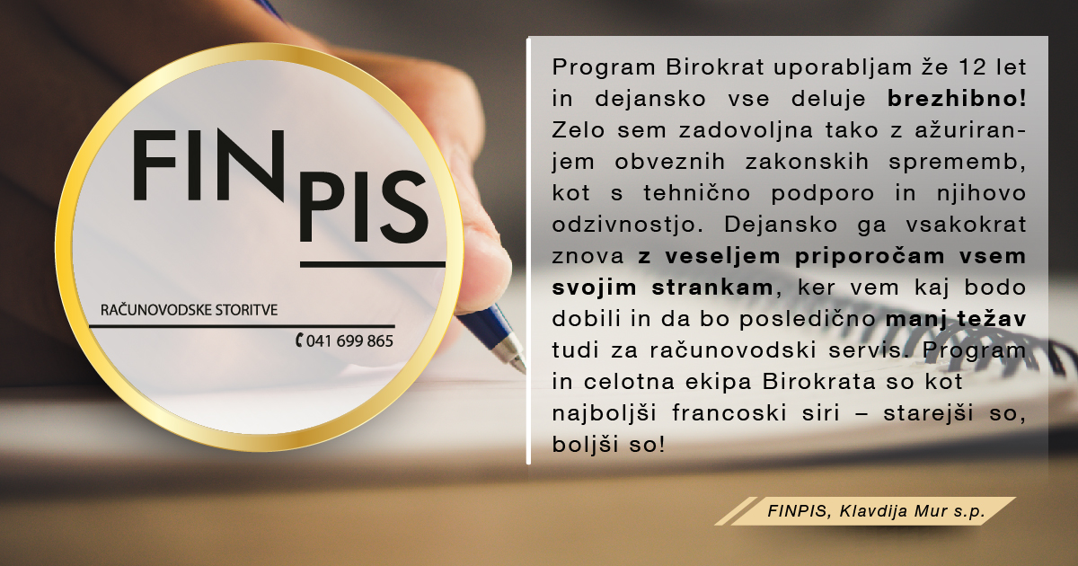 Program Birokrat uporabljamo že od leta 2001 in smo z njim zelo zadovoljni. Program je enostaven in prijazen za uporabo, je zanesljiv in ažurno dopolnjen z zakonskimi spremembami. Všeč nam je, ker ima veliko opcij, možnih načinov pregledov in analiz, ki jih stranke rabijo pri svojem nadaljnjem delu. Prav tako so tudi vsi zaposleni v podjetju prijazni in ažurni pri reševanju nastalih težav in problemov. Poleg vsega navedenega pa je program tudi cenovno ugoden in ga z veseljem priporočamo .