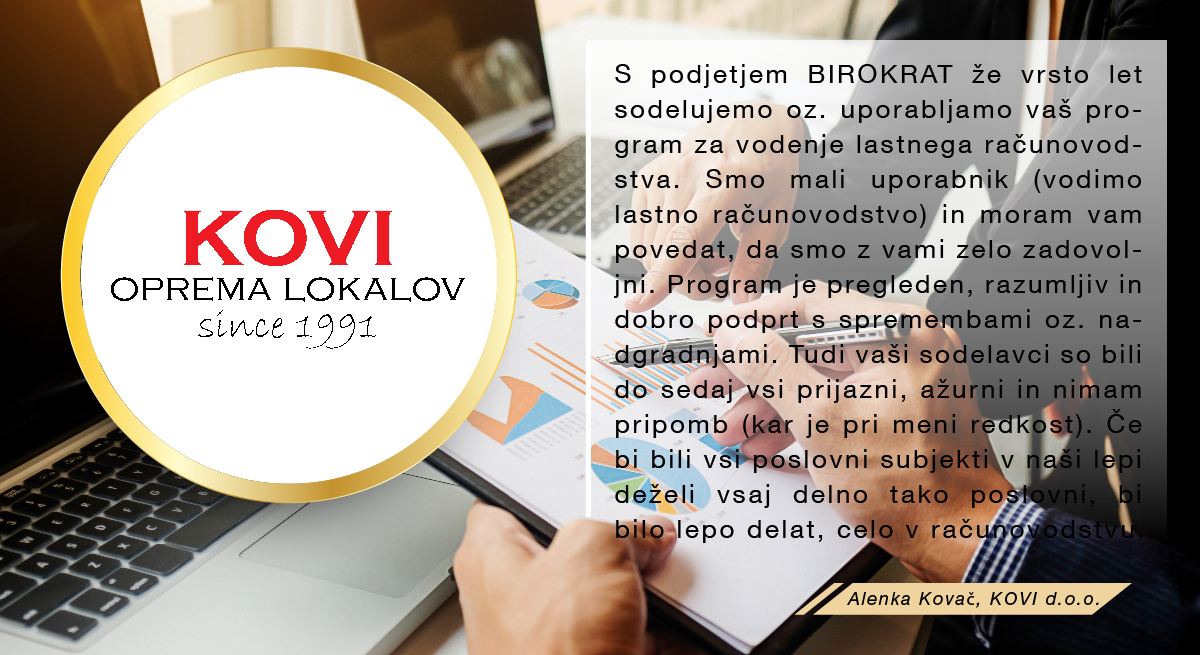 Program Birokrat uporabljamo že več kot 10 let in smo z njim zadovoljni. Uporaba je enostavna, zato je uvajanje novih sodelavcev hitro in učinkovito. Uporaba in vzpostavitev programa je cenovno ugodna. Program priporočamo vsem, ki želijo poenostaviti poslovanje.