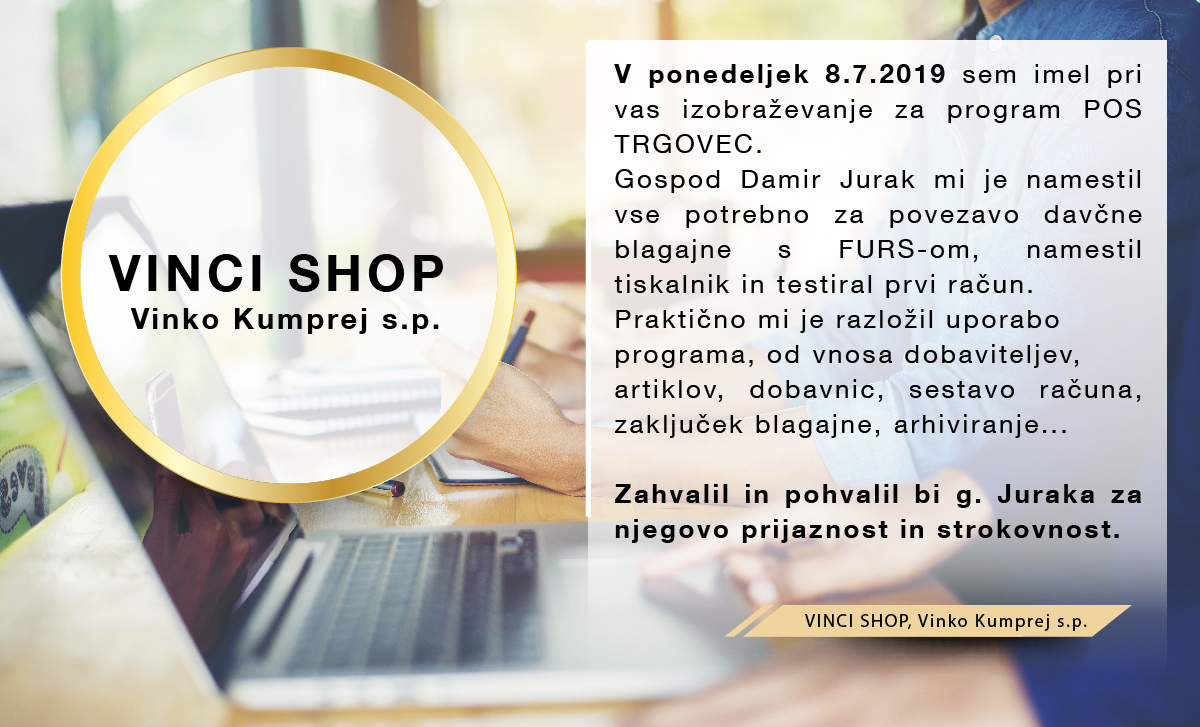 Z davčno blagajno sem zadovoljna. Pomoč preko telefona je odlična, sploh zelo v redu je gospa Miša, pa tudi Lili, ki obvlada plače.